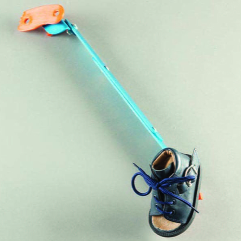 Ортез для отведения бедра изготовлен из алюминия. Пара ботинок, изготовленных специально для ортезов, размещена между обеими ногами.